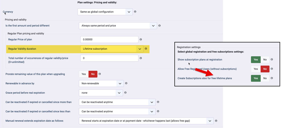 In answer to your question, the free plan, yes, the free plan is set up as lifetime, and I think I set up the global setting correctly (as shown below).Is the free plan a free lifetime plan? If so within CBSubs > Settings > Global ensure you've configured for free lifetime plans to create subscriptions as that's a situation where usergroup management won't work as expected since their free lifetime plan won't actually create a subscription. So going back to my earlier example of usergroups