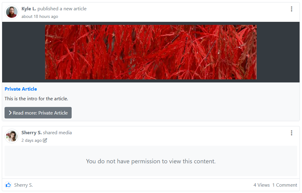 Both posts are aggregated away. Notice username links, etc.. are all disabled. Article and Page activity will still render basically as they normally would. Preview articles will ONLY render their title, intro text, and intro image with readmore rendering if there's full text. Articles also will not link if there is no readmore text.