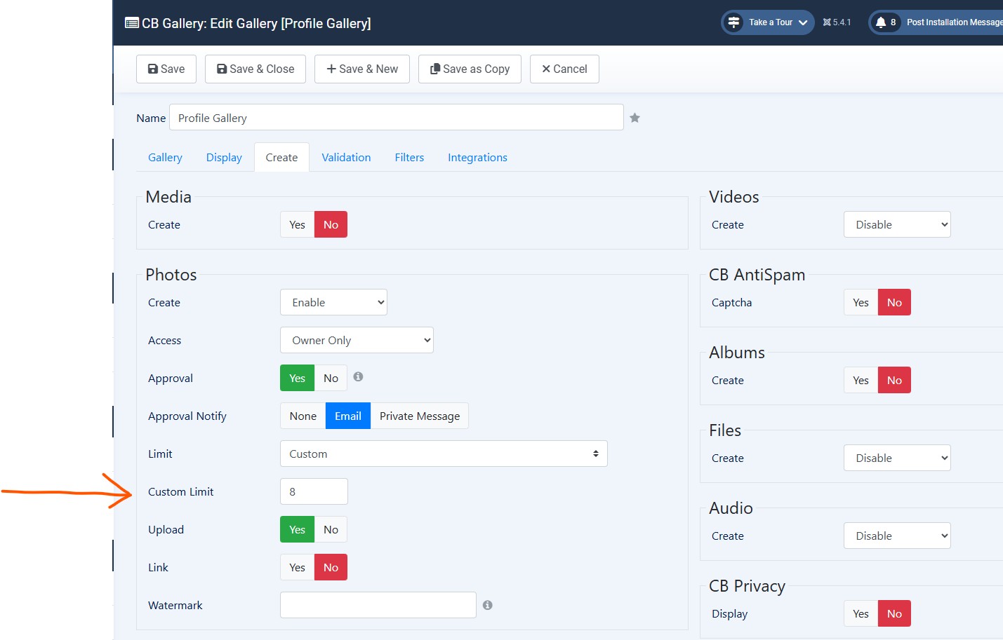 In the backend I do the following setting (the limit of fotos to be uploaded is 8