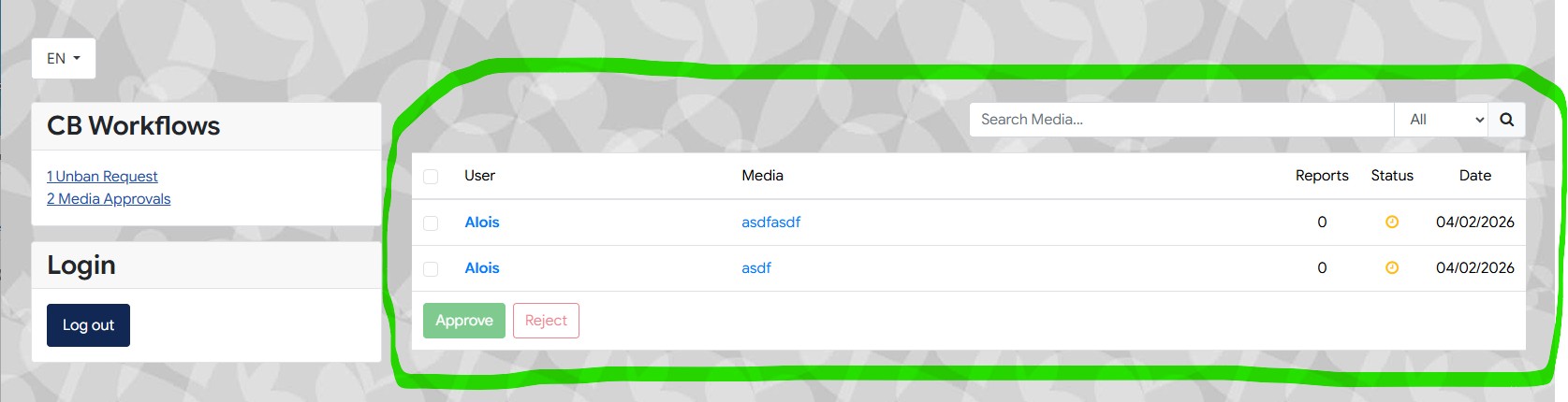 If as moderator logs into the webpage in order to approve the uploaded gallery images of users the corresponding gallery images (to be approved) will be presented as a list which looks as follows:
