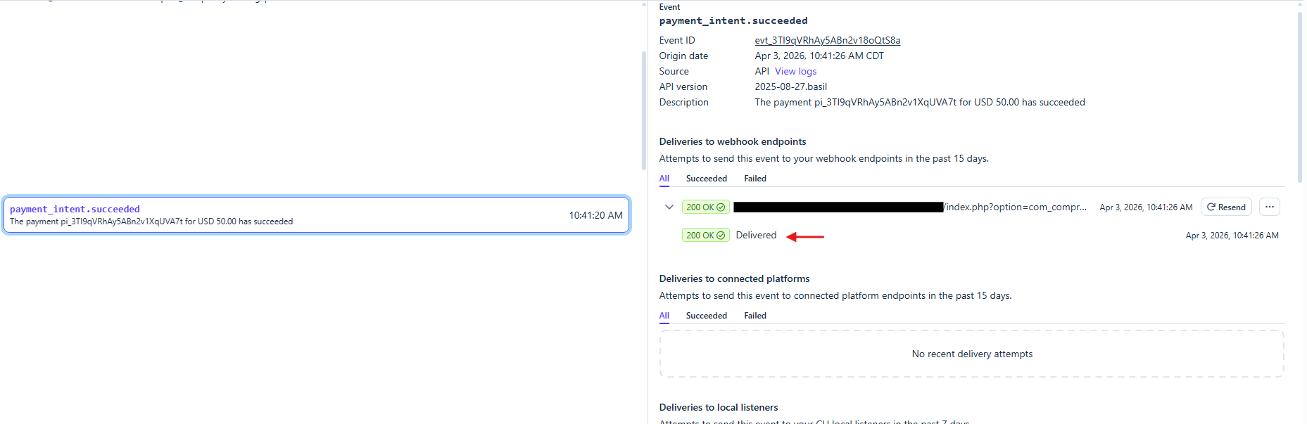 Please be sure your webhook is only sending the events CBSubs is expecting. The list of events is within your CBSubs Stripe gateway configuration. The below for example would be a successfully received event.