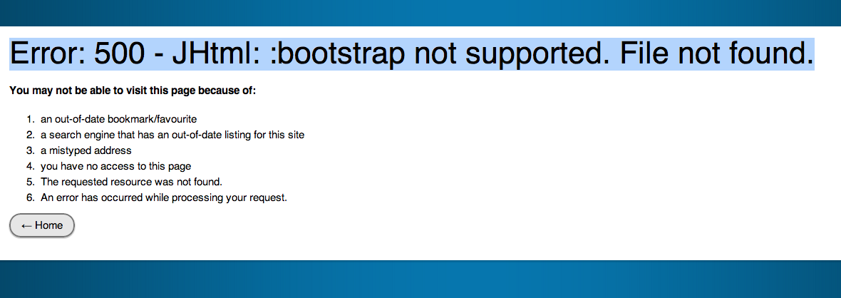 When I try to upload a new profile image i get this error Error: 500 - JHtml: :bootstrap not supported. File not found.