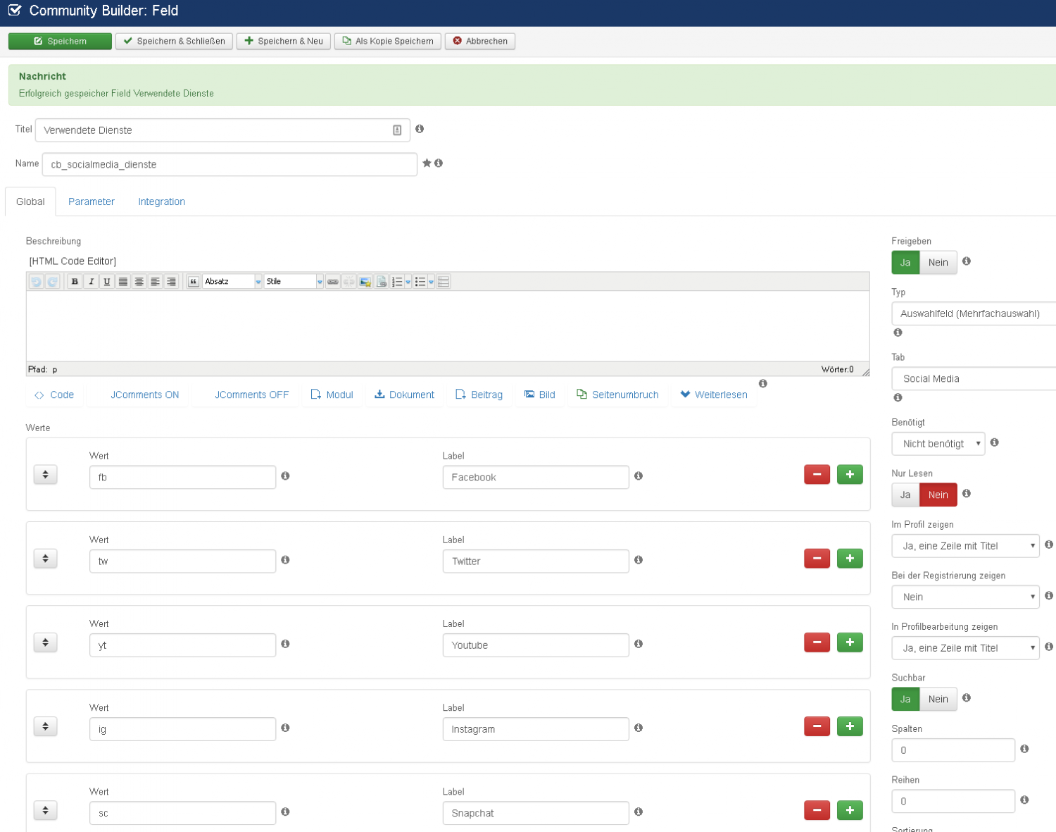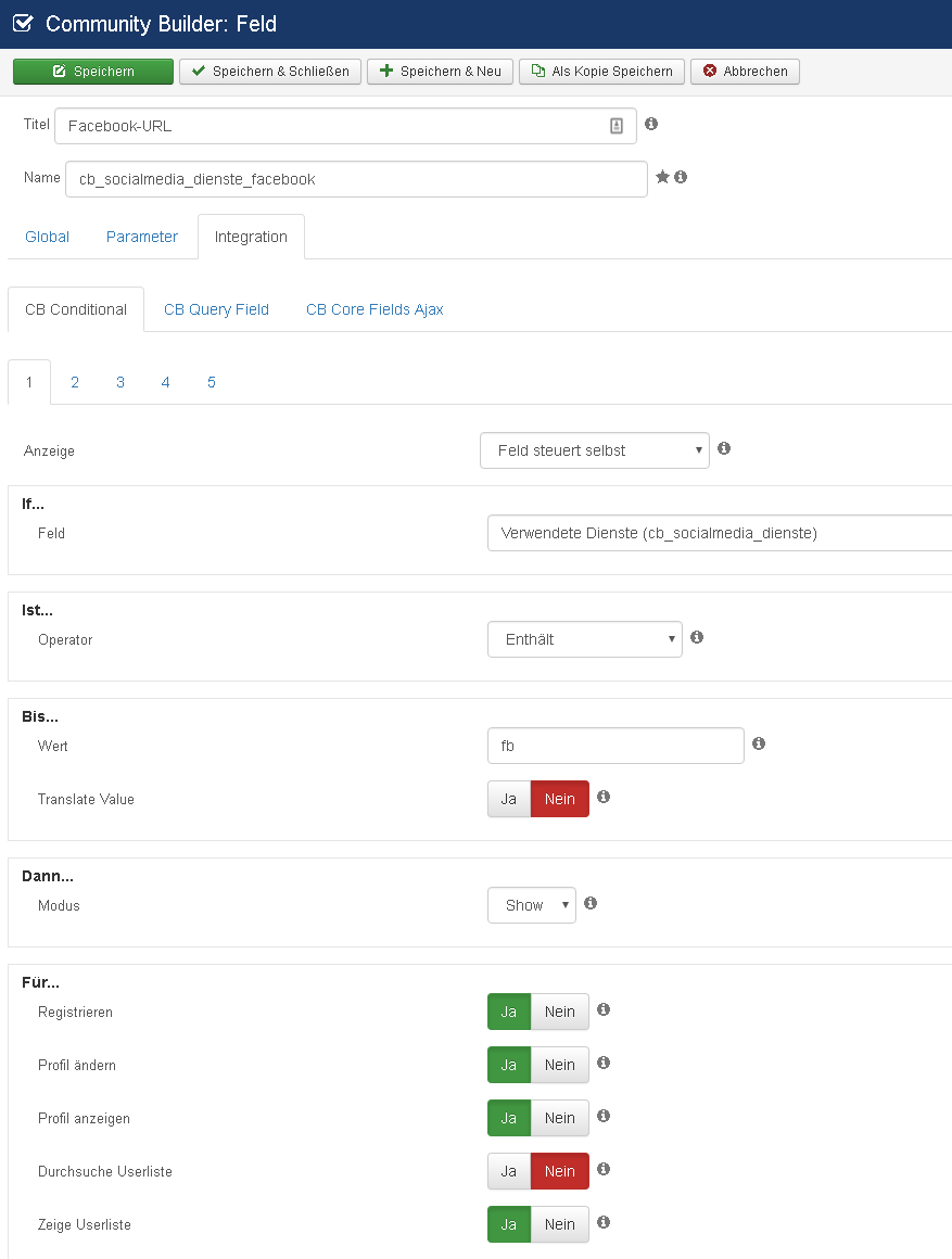 I now like to show up a URL field (here the URL Field for "Facebook") when checking "Facebook" in the checkboxfield.