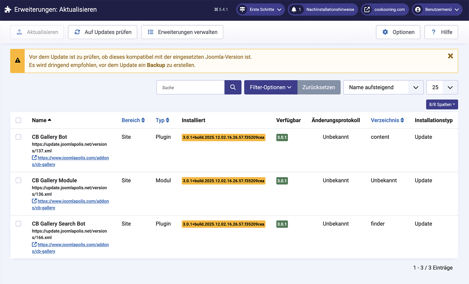 Hi, since about 2or 3 weeks I hav 3 entries for CB Gallery updates in the Joomla uptate section. Today I updated via CB to the newest version of CB Gallery, 3.0.1+build.2025.12.02.16.26.57.f35209cea, but the entries are still visible. Why?