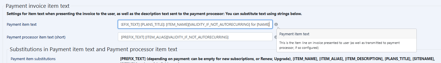 I didn't change the parameter (payment item text). It was already set as you suggested. It doesn't appear to be affecting the text of the payment notification email sent by the payment processor. I've also looked at my CB invoices. I see the correct text listed in the body of the invoice, as shown here in the config with full name.