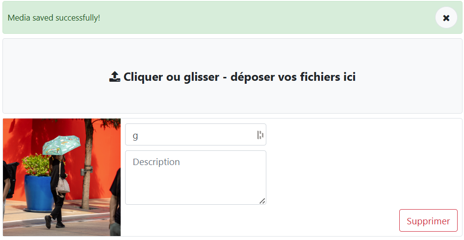 After the user uploaded images in its gallery, there is first a save button appearing (title seems mandatory to get it). After saving ( message "media saved successfully"), the modal window stay open. It is a bit confusing because i think there should be a return to the main page ( i mean the album content with new images)....