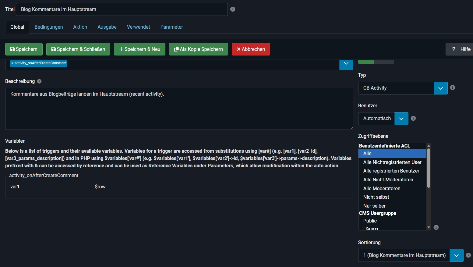 I've already tried several approaches. First, I created a CB Auto Action with various triggers such as "activity_onAfterCreateStreamComment" and "activity_onAfterCommentStreamCreate." I used the asset "article.51" as the condition and tried to create a new activity in the "Recent Activity" stream. However, the Auto Action doesn't seem to be triggered at all; even a test with debug output (var_dump) shows no reaction.